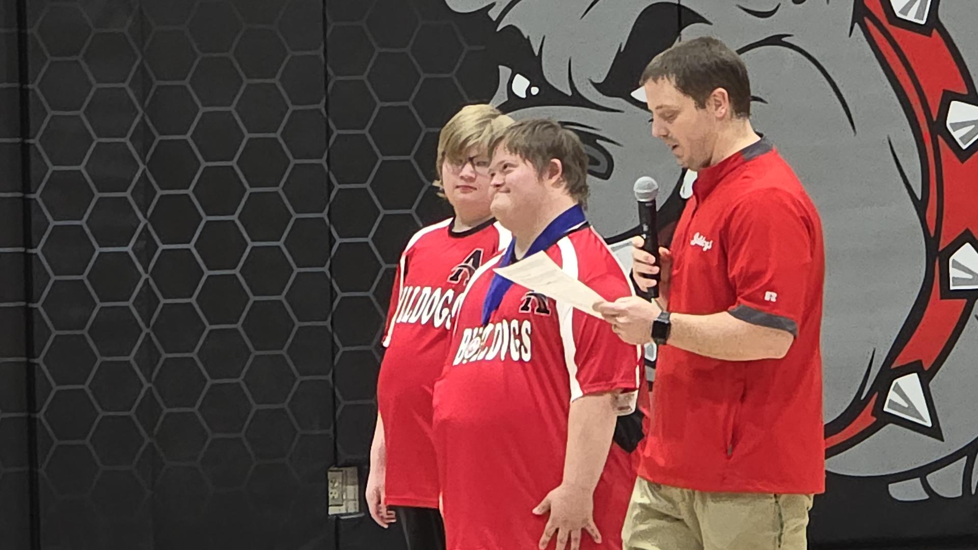 On Jan. 28, four Bulldogs showcased their skills in shooting, dribbling, and passing at the Special Olympics basketball skills competition. Ryan Barglof, Gaje Petersen, and Alyssa Moody all secured first-place finishes and will advance to the State Special Olympics competition in Iowa City on March 14. Adam Henrich also earned a strong fourth-place finish in a highly competitive bracket. (pictured from left: Alyssa Moody, Gaje Petersen, Mr. Andy Jacobson)